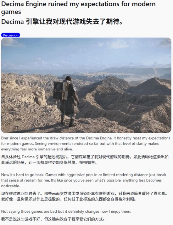 这位玩家表示,远景渲染得那么远、那么清晰,整个世界更具沉浸感,但也带来副作用:现在很难回去玩那些有明显加载延迟或渲染距离有限的游戏。观点迅速获得数千点赞,众多玩家称这是技术的诅咒,一旦见识过真正的次世代,就无法忍受平庸。