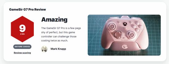 IGN发布国产游戏手柄GameSir G7 Pro评测,给出9分高分。简评称,盖世小鸡G7 Pro距离完美仅几步之遥,但足以挑战价格贵出一倍的产品。