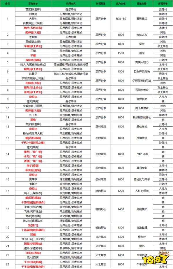 3、远征忍者图鉴收集图: 以下图表展示的是往期远征忍者所属的图鉴和绘卷,以供各位忍者学员更明确的进行收集;