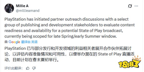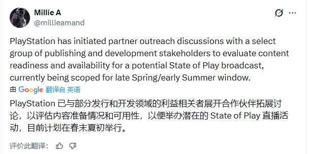 据业内人士millieamand透露,索尼互动娱乐已开始与部分发行商和开发商沟通,评估潜在State of Play发布会的游戏内容与准备情况。这场发布会计划于春末夏初举行,印证了此前关于5月举办的传闻。