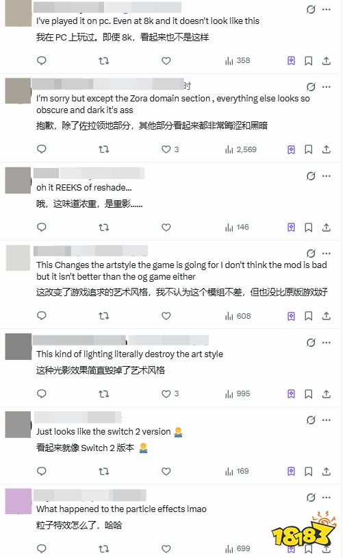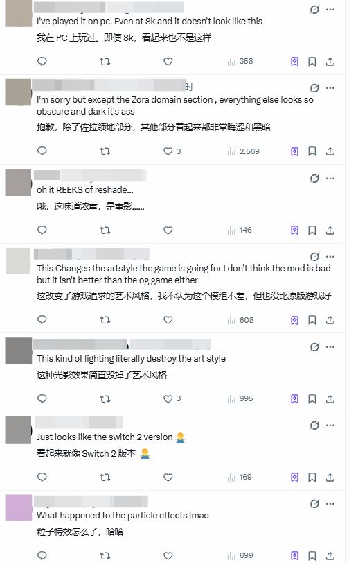 演示视频中,原本带有清新渲染风格的海拉鲁大陆被赋予极强光影效果、高动态范围对比及写实质感,近乎“照片级”的画质让部分玩家感到震撼。然而评论区绝大多数资深玩家对此并不买账,认为这种“写实风”是对任天堂顶级艺术指导的破坏:许多玩家指出MOD过度依赖后期处理,画面显得“脏”且油腻,完全丧失了原作清爽美感;有网友辛辣点评称“太写实了,完全不可接受”。也有理性声音认为,MOD本身技术水平不俗,但强行改变艺术基调的做法并不优于原版,只能算作一种实验性视觉尝试。