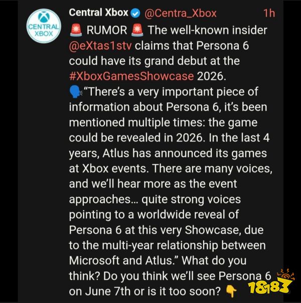 近日关于《女神异闻录6》的发布传闻再度升温。据爆料人Extas1s透露,该作可能于2026年6月7日举行的Xbox游戏展上正式亮相。他指出,过去四年Atlus一直选择在Xbox活动上公布作品,加上微软与Atlus的多年合作关系,有“相当强烈的信号”指向该作将在本次展会全球揭晓。
