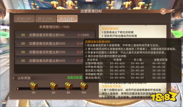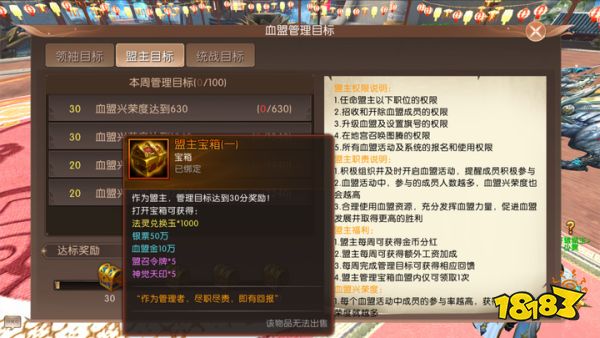 分功各得金玉满,合璧同收勋业新。为了让联盟目标更明确,收效更高,本次为血盟管理目标进行了分工升级,也给出更为丰厚的奖励。