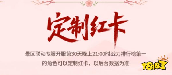 在景区联动专服开服第30天晚上21:00时,战力排行榜第一的角色将拥有定制红卡特权!一个月的拼命,换取全服唯一荣耀!秀出你的实力,让大家看看谁才是真正的No.1!