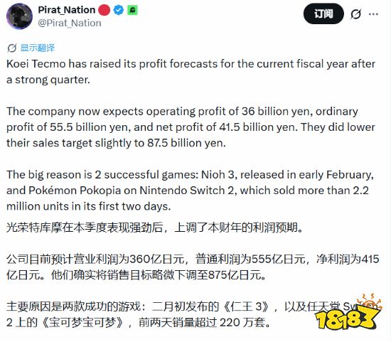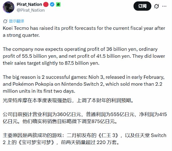 报道指出,此次利润预期上调的核心原因,是两款作品的市场表现超出预期:二月初推出的PS5主机独占游戏《仁王3》(同样登录PC),以及任天堂Switch2完全独占的《宝可梦Pokopia》,发售两日销量便突破220万套,成为拉动业绩的关键。