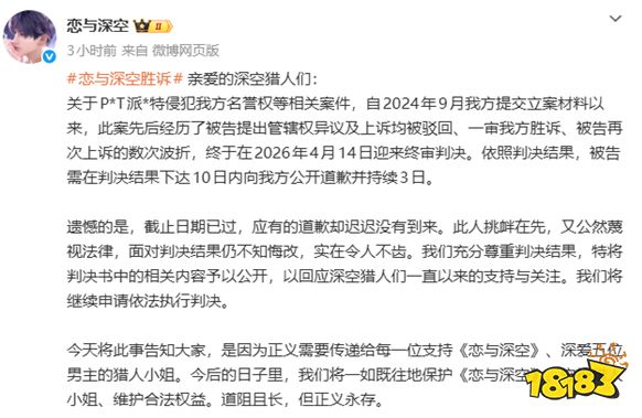 4月25日,《恋与深空》官方发布公告,公开与歌手派克特名誉权纠纷案的终审判决书。案件已终审胜诉,但对方逾期未按判决要求公开道歉,官方表示将依法申请强制执行。整件事要追溯到2024年8月,派克特发布相关视频,未经允许使用《恋与深空》画面,并用侮辱性、攻击性言辞贬低游戏与玩家,对游戏造成不良影响。