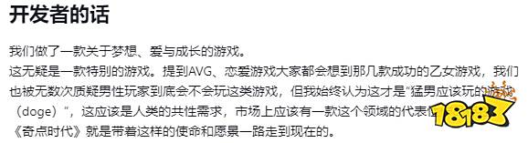在手游市场,男性是否也会玩恋爱游戏?《奇点时代》认为会,在“开发者的话”中,他们将聚焦梦想与成长,而非仅是恋爱,做件特别的事。