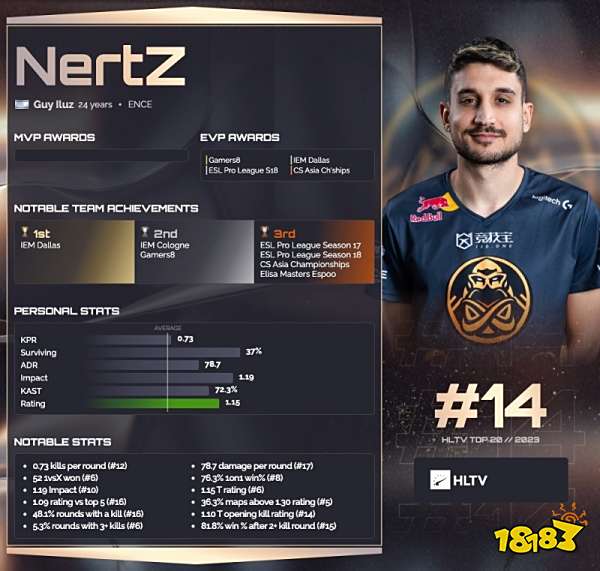凭借出色的表现以及对ENCE的重大贡献,24岁的以色列枪男Guy Iluz | NertZ首次入选TOP20。