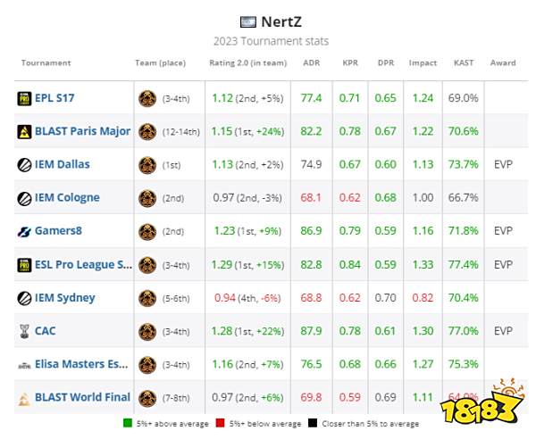 NertZ本年度赛事数据,绿色为高于赛事平均数据5%以上,红色为低于平均5%以上,灰色为接近平均