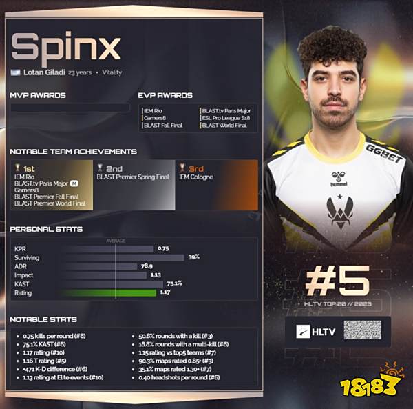 比利时赛事结束不久后,Spinx被Vitality签下,这位以色列选手由此开始向顶级职业选手的方向攀登。尽管在入队初期未能顺利适应新的环境,但他在年初的高峰使他在2023年的年度Top 20榜单中位列第18。