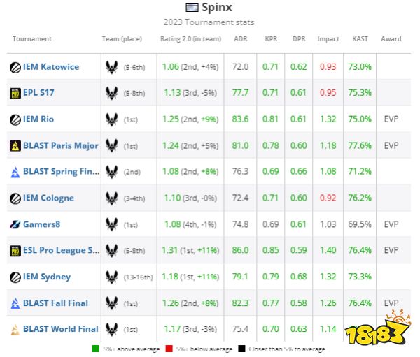 Spinx 2023年赛事数据,绿色为高于赛事平均5%以上,红色为低于平均5%以上,灰色为接近平均值