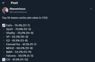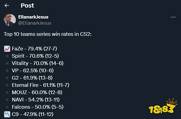 有国外网友统计了顶级战队在CS新版本线下比赛中,系列赛(BO3或者BO5)比赛的胜率,其中FaZe以79.4%的胜率高居第一。