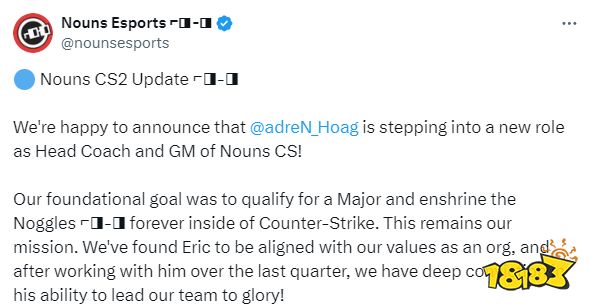 北美俱乐部Nouns今日官宣Eric Hoag | adreN将担任战队总经理与主教练职务。原主教练SEMPHIS职责发生转变,他现在将担任战队绩效教练,负责团队内容创作方面的工作。