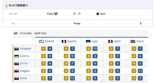 在BLAST巅峰赛S1半决赛中,Vitality以2-0完胜Spirit,成功挺进决赛。本场比赛的最大看点无疑是ZywOo与donk的巅峰对决,最终法国巨星以12-8的对位数据略胜一筹,帮助队伍在Mirage和Nuke上分别以13-8、13-9取胜。