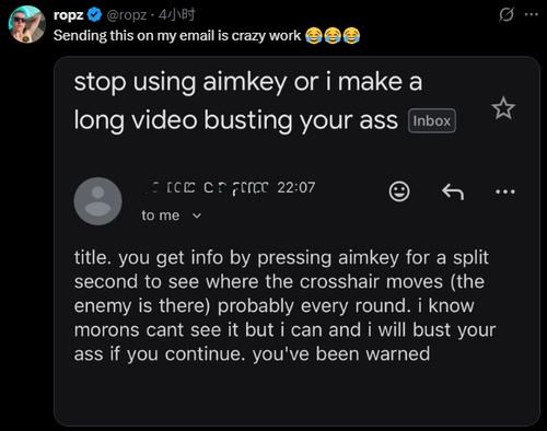 ropz在动态中贴出了这封邮件的截图。邮件标题为:“停止使用瞄准键,否则我会做一个长视频揭露你的把戏”。正文中,发件人煞有介事地“指控”道:“你通过瞬间按下瞄准键获取信息,观察准星移动位置(敌人在那里),可能每回合都这样做。我知道某些蠢货看不出来,但我能发现。如果你继续这样做,我会揭发你。已经警告过你了。” 面对如此无稽的指控,ropz的回应充满了无奈与幽默,他评论道:“通过邮件发这个真是够离谱的。”