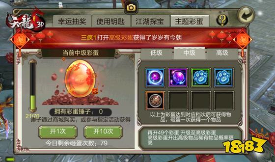 玩家砸取20次低级彩蛋能够升级中级彩蛋,道具奖励也焕新升级,砸取50次中级彩蛋后可开启高级彩蛋,高级彩蛋有机会掉落紫色精魄,品质远高于迎春图赠送的绿色彩蛋,这波不亏!