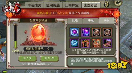 主题彩蛋一共分为低级、终极、高级三种,可以通过多次砸取升级彩蛋。彩蛋等级越高奖励也越丰厚。低级彩蛋可以获取白色、绿色精魄、升星丹、四圣象系列等道具。
