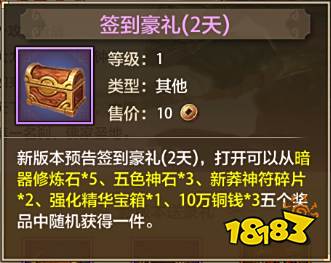 新版本预告签到豪礼(2天),打开可以从暗器修炼石5、五色神石3、新莽神符碎片2、强化精华宝箱1、10万铜钱3五件奖品中随机获得一件。