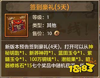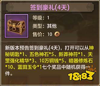 新版本预告签到豪礼(4天),打开可以从神秘钥匙1、暗器修炼石10、蓝田玉令1、五色神石5、新莽神符1、天罡强化精华1、10万铜钱5,七·件奖品中随机获得一件。