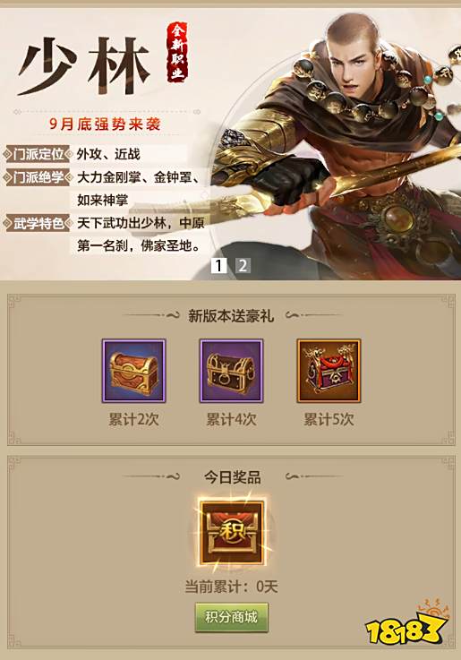 少林-尊贵威严的武僧形象,信奉佛教,袈裟为服,头顶无发,颈挂佛珠,手提法杖。少林武功博大精深,七十二绝技更是天下一绝,江湖中素有“天下功夫出少林,少林功夫甲天下”之说。