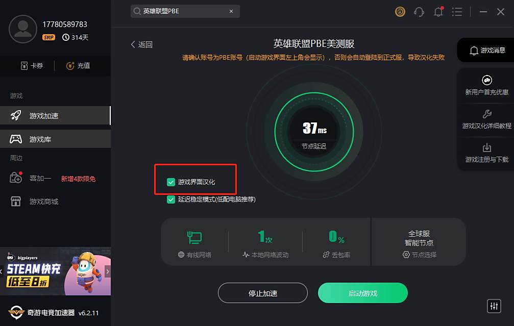 奇游加速器,不仅可以解决延迟卡顿,而且还支持英雄联盟PBE测试服一键汉化,使用方法非常简单,玩家只需要在【英雄联盟PBE美测服】页面中勾选【游戏界面汉化】就能完成汉化。