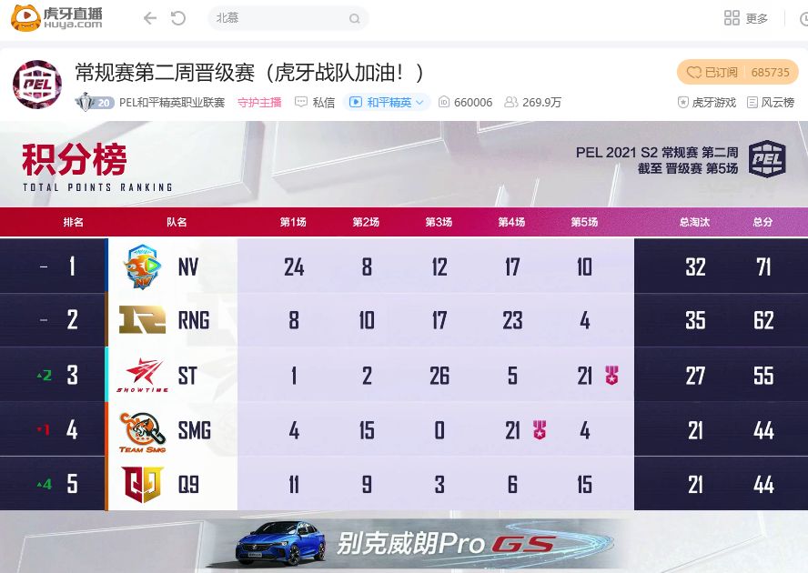 北京时间2021年5月13日,虎牙直播和平精英PELS2赛季常规赛第二周Day1正式开战。伴随伞兵状态复苏拿下PEL和PEC职业联赛首个千杀里程碑,NV腾讯视频王者归来勇夺71分拿下积分榜首并锁定周决。另一边RNG同样找回世界赛所向披靡的正面打法,最终单轮拿下全场最高的35个淘汰携手NV提前打卡下班。而STE则成为老倒霉蛋,在积分相同的情况下以1个淘汰分差距被SMG与Q9拉下马来无缘提前晋级。