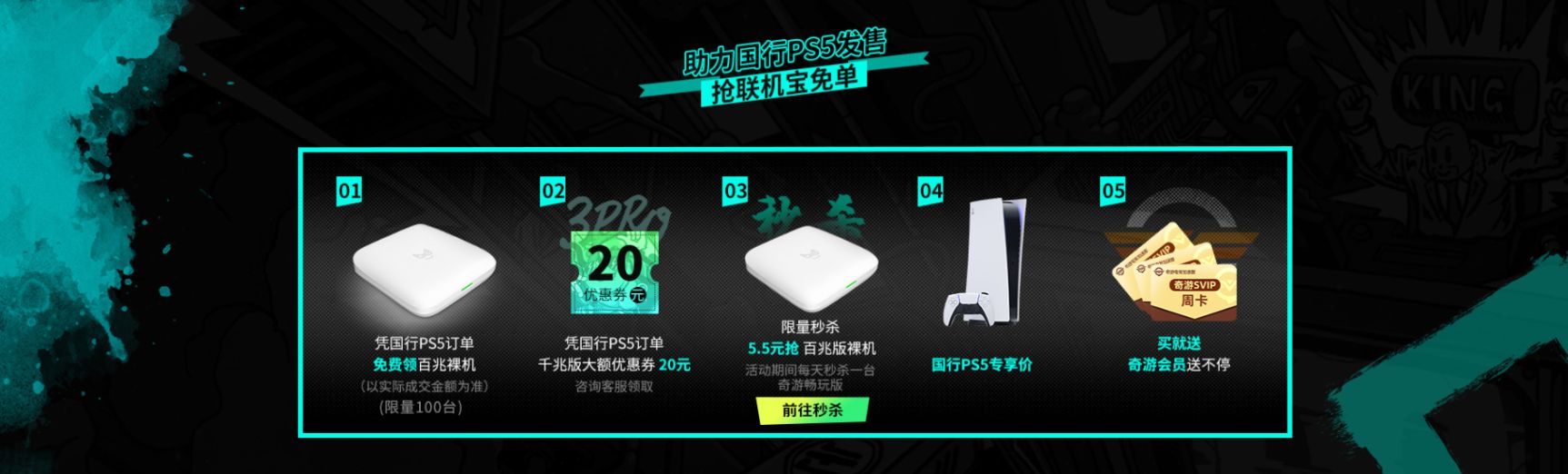 喜迎新世代,奇游联机宝为国行PS5助力,重磅福利上线!5月15日-5月31日,奇游联机宝特卖活动正式开启,千兆版主机加速盒大额优惠券送不停,百兆版主机加速盒0元购,更有抽奖福利、晒单征集活动等着你!
