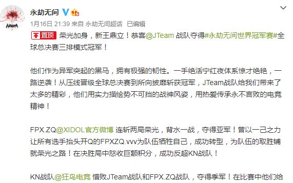 近日《永劫无间》官方在微博上发文,恭喜JTeam战队夺得《永劫无间》世界冠军赛全球总决赛三排模式冠军!