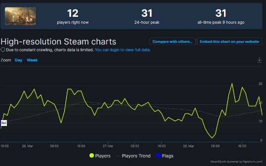 但跟据SteamDB数据显示,免费试玩版的同时在线玩家数最多的时候才31名玩家。
