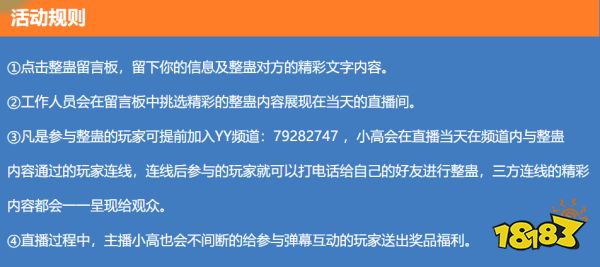 ③凡是参与整蛊的玩家可提前加入YY频道:79282747 ,小高会在直播当天在频道内与整蛊