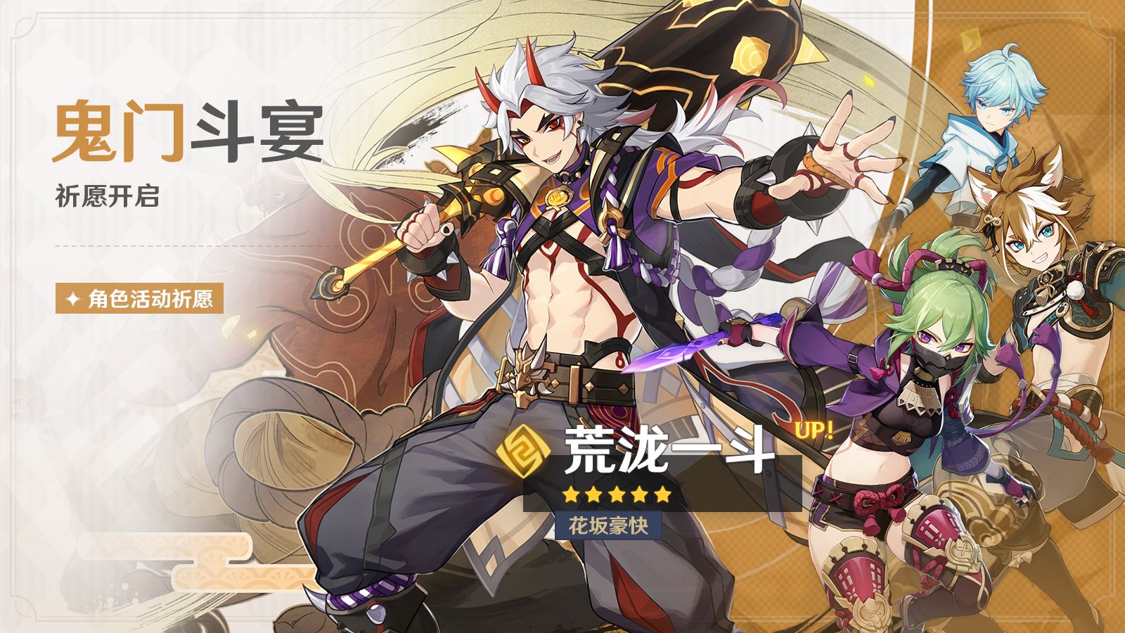 2022年6月21日18:00至2022年7月12日14:59,角色活动祈愿「鬼门斗宴」限时开启,限定五星角色「花坂豪快·荒泷一斗(岩)」迎来概率UP。