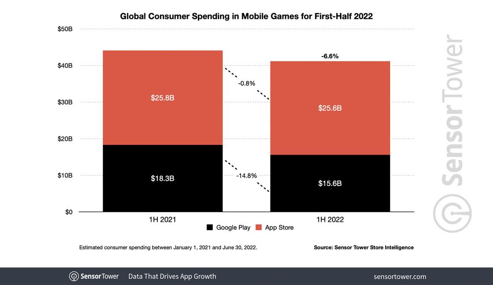 今天手游数据收集公司 Sensor Tower 发布了一份新报告,称 2022 年上半年移动游戏消费者支出达到 412 亿美元。 与 2021 年同期相比,该数字同比下降 6.6%。