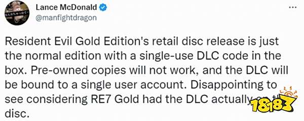 今日(10月28日)《生化危机8:黄金版》将正式发售,包含游戏本体,以及萝丝魅影、第三视角模式和佣兵模式这三个DLC。但最近知名游戏爱好者Lance McDonald发推文称,《生化危机8:黄金版》实体版光盘不包含DLC内容。