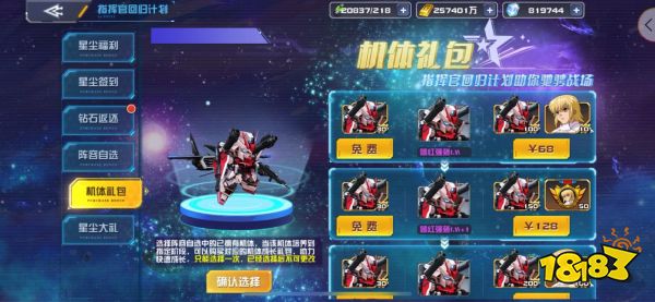 除此之外,七周年回归活动还包括【星尘福利】【星尘签到】【钻石返还】【阵容自选】和【机体礼包】。玩家只需要每天上线完成七天星尘签到,即可免费领取限时机体碎片和宝箱,五个阵容自选开局阵容限时机体可供随意挑选,再加上限时的机体礼包,可以帮助玩家轻松完成六星养成。