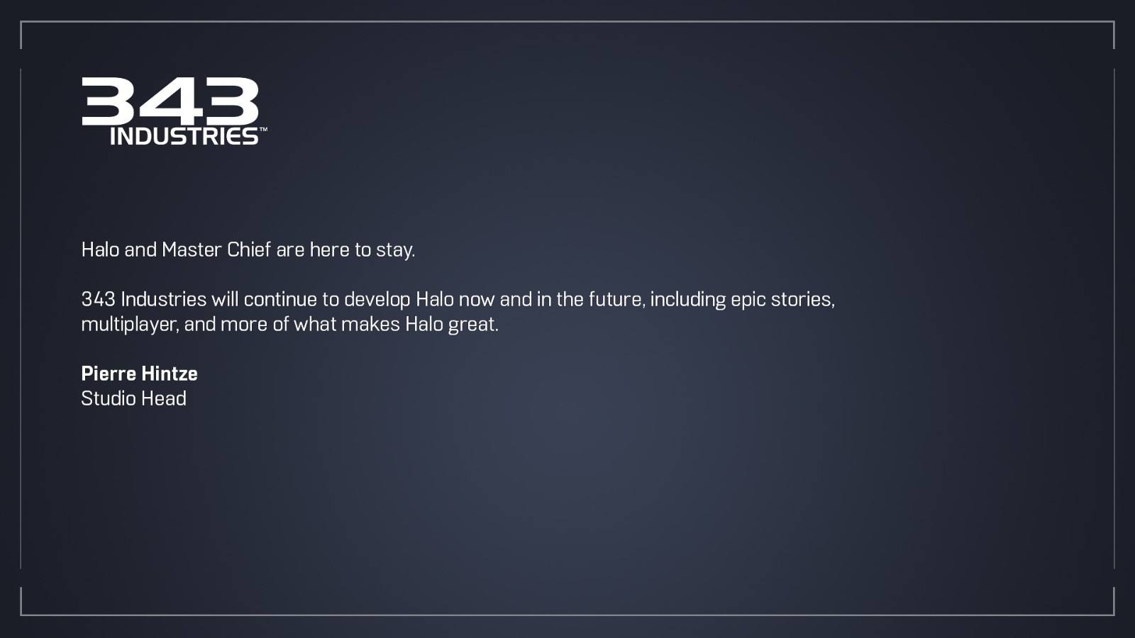 “343工业现在和未来将继续开发《光环》,包括史诗剧情,多人游戏,以及更多使《光环》伟大的内容。”