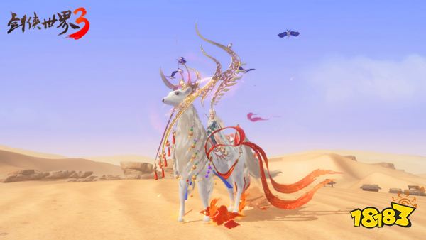 敦煌主题联动第一弹,高品质联动坐骑“九天玄梦”踏梦而来!“九天玄梦”以敦煌莫高窟壁画《鹿王本生图》中的九色神鹿为灵感,洁白神圣,灵动优雅。神鹿头顶金色镂空鹿角,神性光辉引来雀鸟盘桓。颈部毛发如雪,五色珠编织而下,身披繁复金饰,尾系飘摇丝绸,闭目垂首,悲天悯人,仿佛从瑰丽的壁画上一跃而下,降临人间。搭配铸魂特效,九色神鹿带着敦煌遗风,跨越千年时光,入梦江湖!