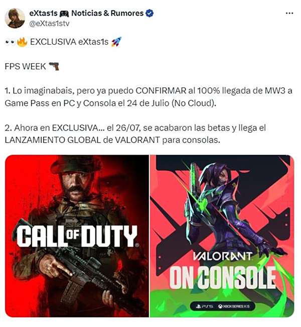 除此之外,在同一篇爆料推文中,eXtas1stv再次确认了《使命召唤:现代战争3》100%将于7月24日加入XGP(主机和PC)。