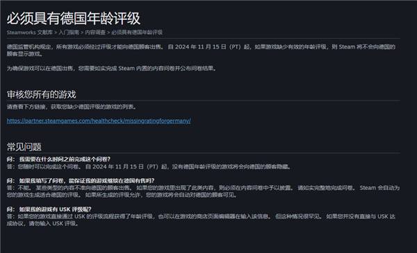德国监管机构近日宣布,自2024年11月15日起,Steam所有游戏必须具有德国年龄评级才能向德国玩家出售。如果缺少有效的年龄评级,那么Steam将不会向德国玩家显示游戏。为确保游戏可以在德国出售,厂商需要如实完成Steam内置的内容问卷并公布问卷结果。