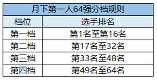 (1)在复赛结束后,进入月下第一人每个门派的64强少侠将根据复赛排名分为4档,分档规则如下: