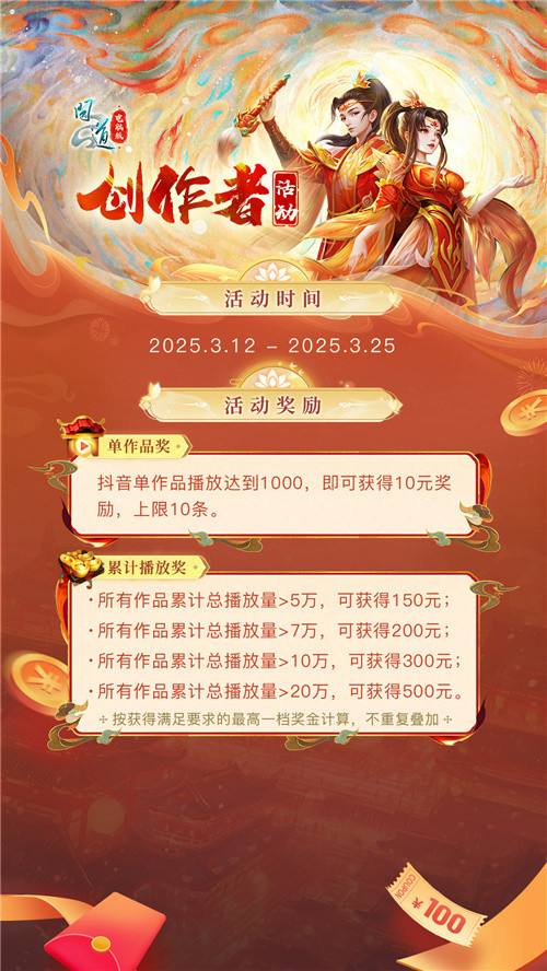 《问道》道十九大服——抖音创作者激励活动正在进行中,2025年3月12日至3月25日,在抖音参与《问道》端游周年返利大服“道十九”抖音视频作品创作,达到播放量将获得对应现金奖励,瓜分2万奖金池,激励你的创意!