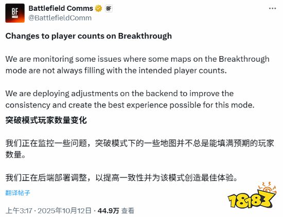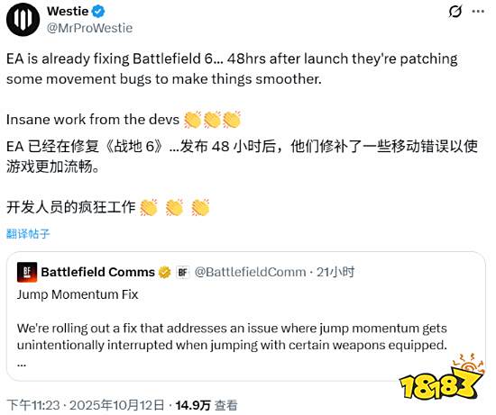 2025年10月10日发售的《战地6》在48小时内火速推出多轮修复更新,解决奖励丢失、安装异常及突破模式玩家数量问题,首席设计师Florian Le Bihan持续监控武器与移动机制优化,社区互动推进匹配机制改进,获玩家好评视为较前作更积极开端 。