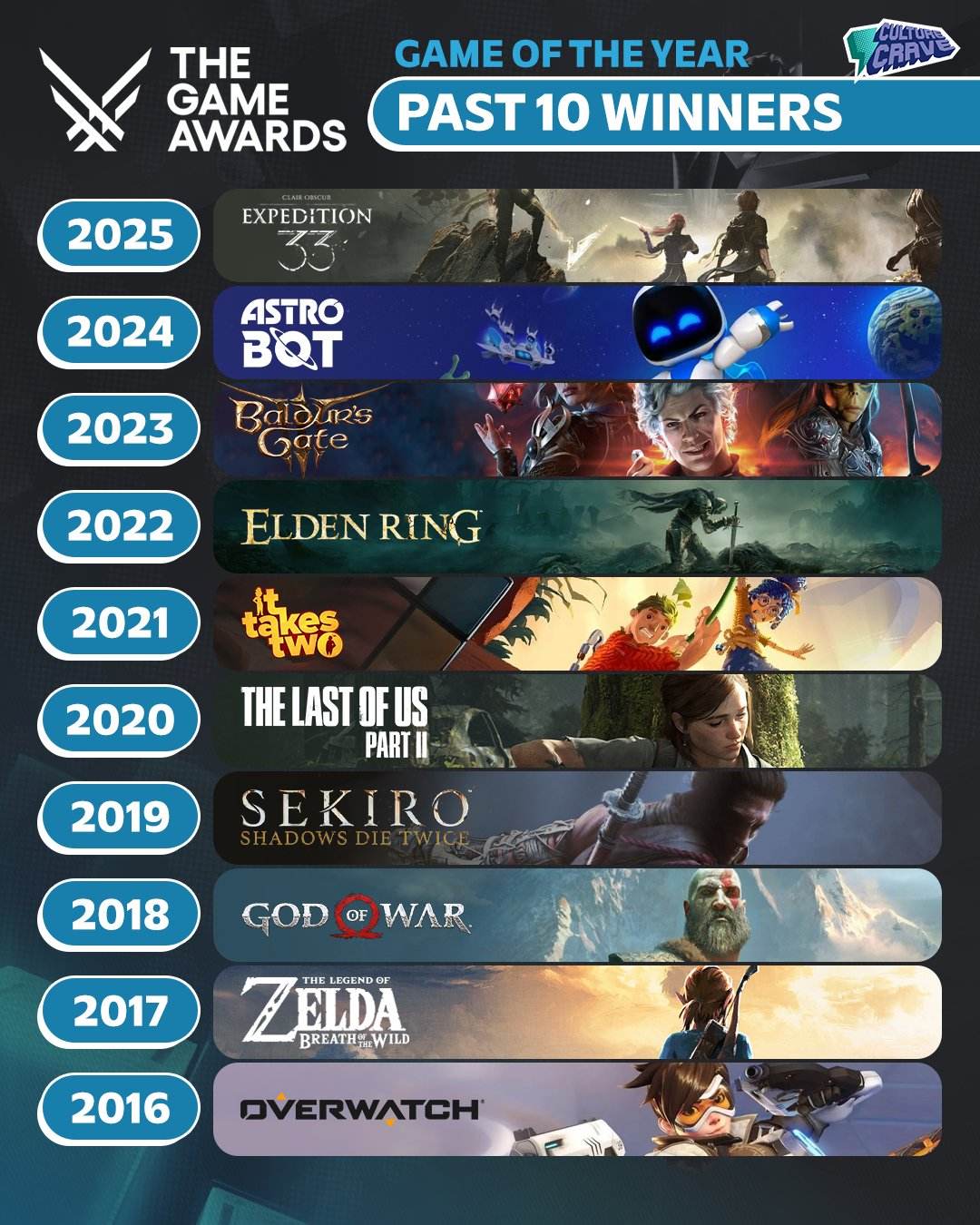 过去十年 TGA 年度最佳游戏列表(2016 — 2025)