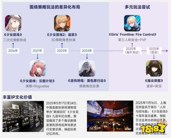 原创游戏IP的塑造是散爆网络的核心潜力,旗下头部IP“少女前线”已发展近十年,积累了大量用户群体。散爆网络对于“少女前线”IP的塑造围绕构筑多元产品矩阵和提升品牌文化价值两方面展开。一方面,围绕IP推出多元玩法的系列产品——从早期围绕初代作品《少女前线》,对战术策略玩法进行差异化布局,随着技术迭代与用户游玩偏好转变,散爆网络也逐步尝试PVP玩法及轻量级创新等与过往品类差异较大的模式,进一步充实产品矩阵。另一方面,持续丰富IP的文化价值,不仅通过推出动漫、衍生品等内容和产品拓展IP影响力,还借助举办音乐会、纪念展等形式实现线上与线下的联动,触达并凝聚核心玩家群体,加深IP与玩家间的情感链接。基于原创游戏IP塑造,使IP生命力得以延长,也使散爆网络在未来依然具备持续增长的潜力。